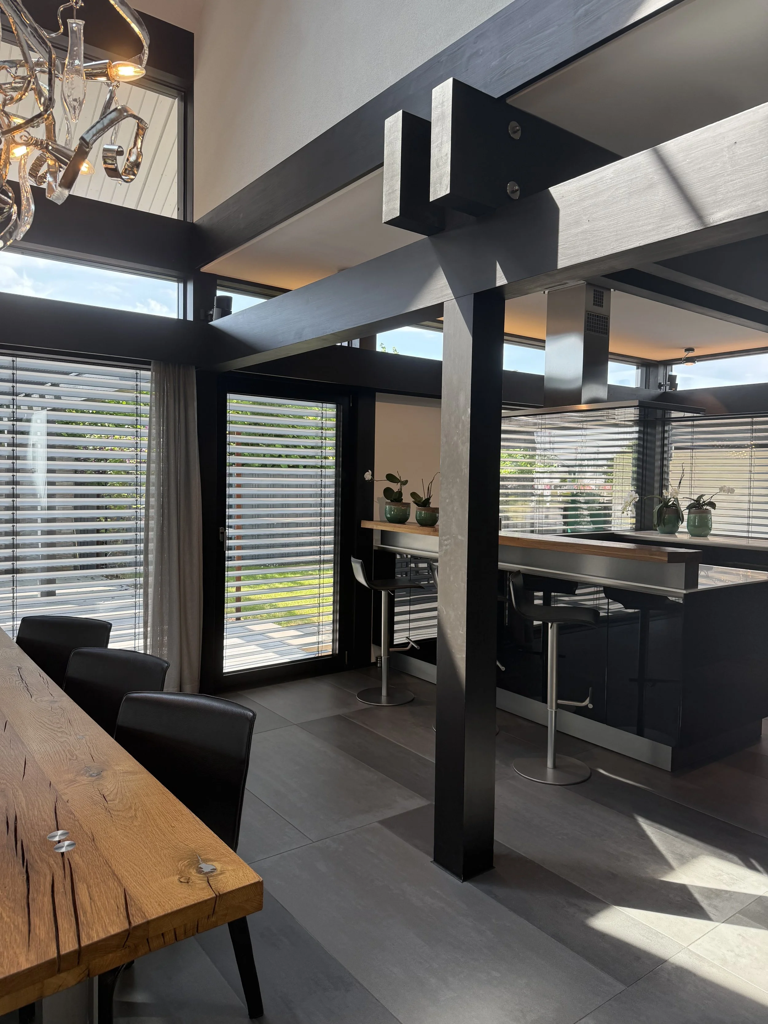 Die offene Küche fügt sich harmonisch in den Wohnraum ein – perfekt für gesellige Abende mit Familie und Freunden. Von hier gelangen Sie auf die große Terrasse, die an warmen Tagen zum erweiterten Wohnzimmer wird.