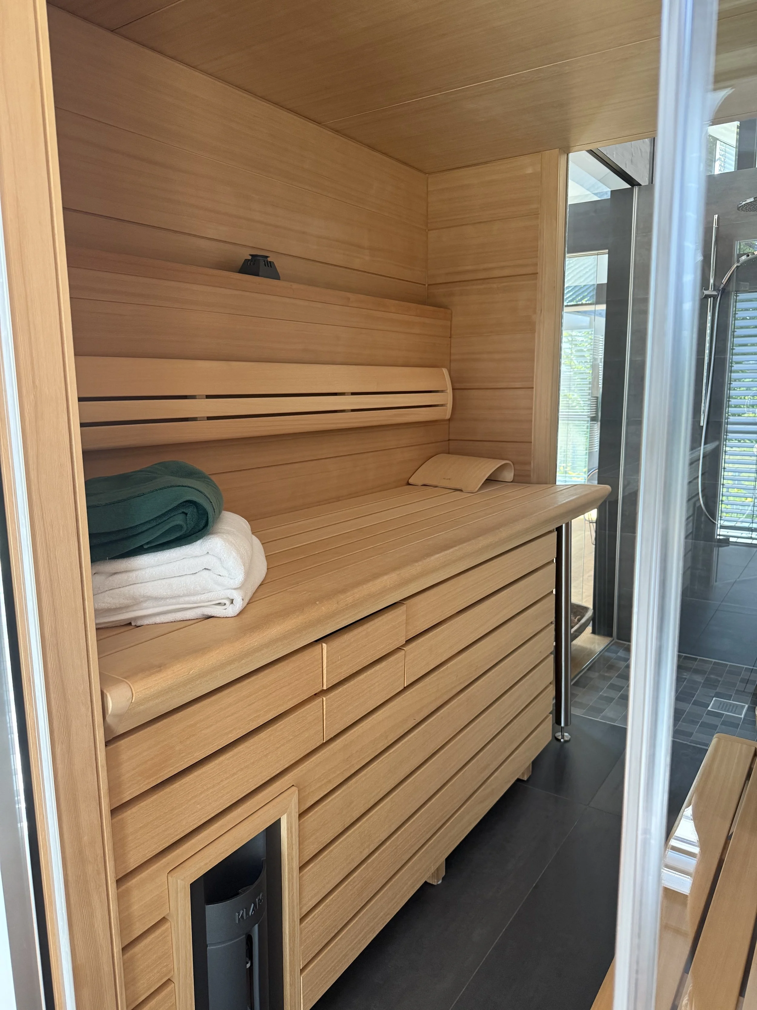 Im Obergeschoss erwartet Sie das Master-Schlafzimmer mit direktem Zugang zu einem luxuriösen Bad en suite, das mit Doppelwaschbecken, Walk-in-Dusche, freistehender Badewanne und einer privaten Sauna ausgestattet ist – Ihr ganz persönlicher Wellnessbereich.