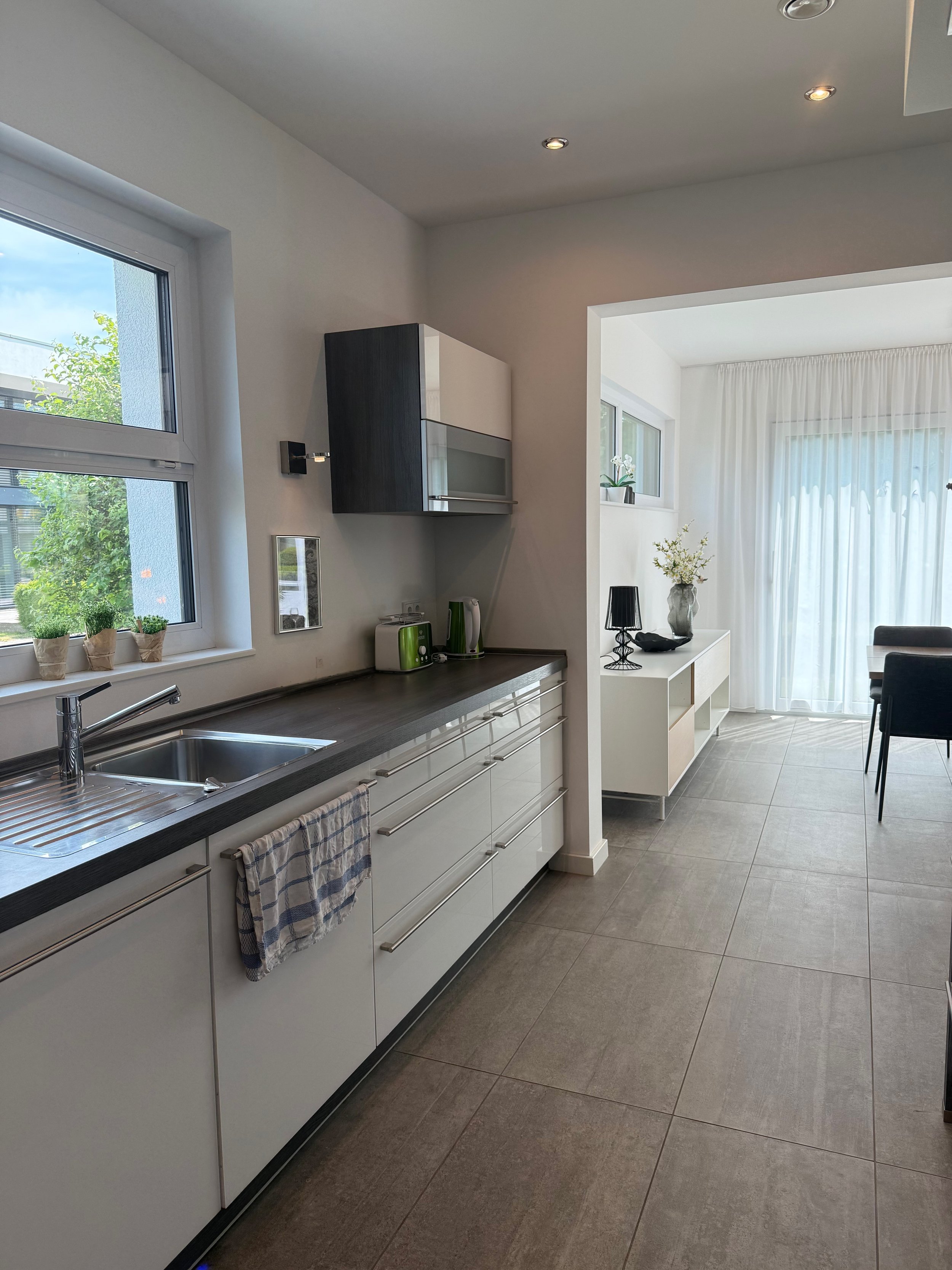 Großzügiger Eingangsbereich mit Garderobe, Gäste-WC, ein modernes Arbeitszimmer, lichtdurchfluteter Wohn- und Essbereich und Zugang zur Terrasse, offene Designküche.Obergeschoss: